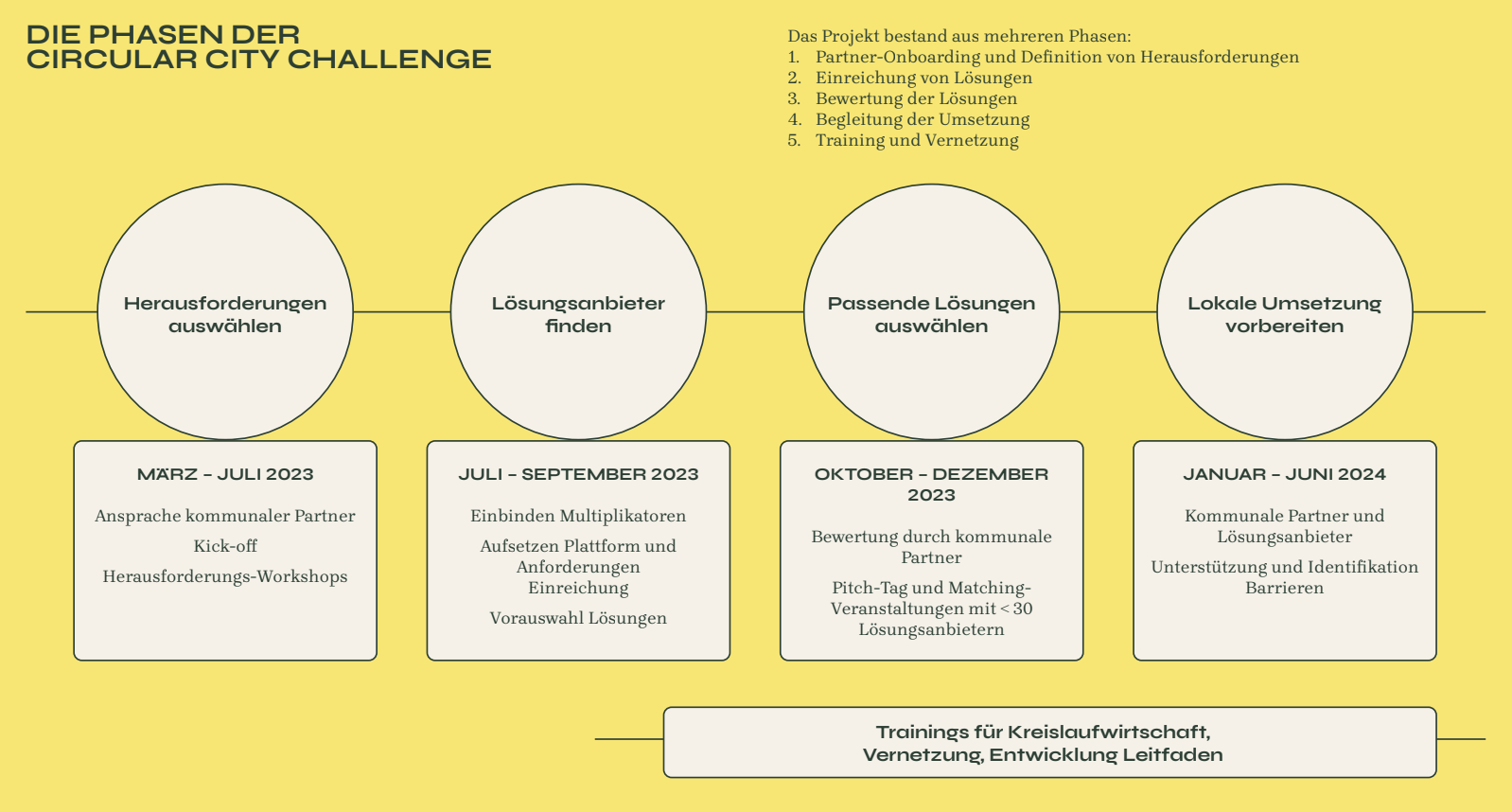 Die Circular City Challenge lief in zwei Durchläufen von November 2021 bis Juni 2022 sowie März 2023 bis Mai 2024. In dieser Zeit wurden Städte, Kommunen und Lösungsanbieter vernetzt, gemeinsame Schwerpunkte erarbeitet und konkrete Ansätze für die Umsetzung entwickelt.