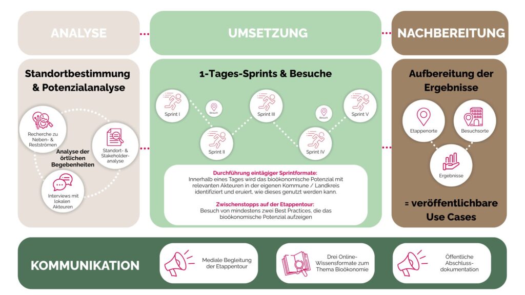 Die Bioökonomie-Etappentour ist als reisendes Beteiligungsformat angelegt. Über mehrere Etappen hinweg werden ausgewählte Kommunen im Schwarzwald besucht. An jedem Etappenort finden ganztägige Bioökonomie-Sprints statt, in denen lokale Akteure gemeinsam bioökonomische Potenziale identifizieren und weiterentwickeln.