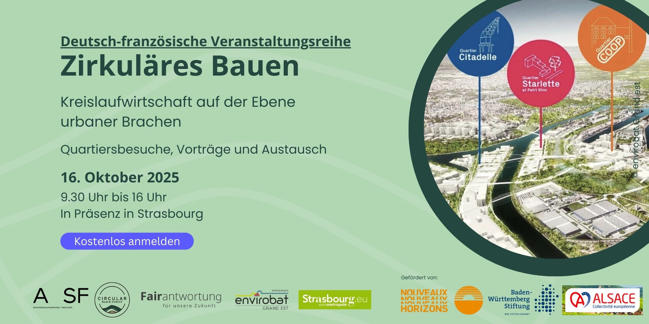 Kreislaufwirtschaft auf der Ebene urbaner Brachen Nach dem erfolgreichen Auftakt unserer deutsch-französischen Veranstaltungsreihe zum zirkulären Bauen widmen wir uns beim zweiten Präsenztermin dem Thema Kreislaufwirtschaft in der Stadtplanung – mit Fokus auf urbane Brachen. Angesichts von Wohnraummangel, angespannten Bodenmärkten und politischen Zielen wie dem französischen „Zéro Artificialisation Nette“ (ZAN) oder dem deutschen Netto-Null Flächenverbrauch kommt der...