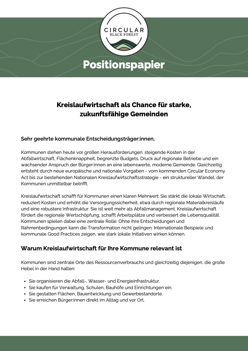 Circular Black Forest bringt Perspektiven aus Wirtschaft, Wissenschaft, Verwaltung und Praxis zusammen und übersetzt diese in konkrete Positionspapiere und Stellungnahmen. Unsere Empfehlungen basieren auf Projekterfahrung, regionalen Stoffstromanalysen, Netzwerkarbeit im Dreiländereck und engem Austausch mit Unternehmen sowie kommunalen Akteuren.