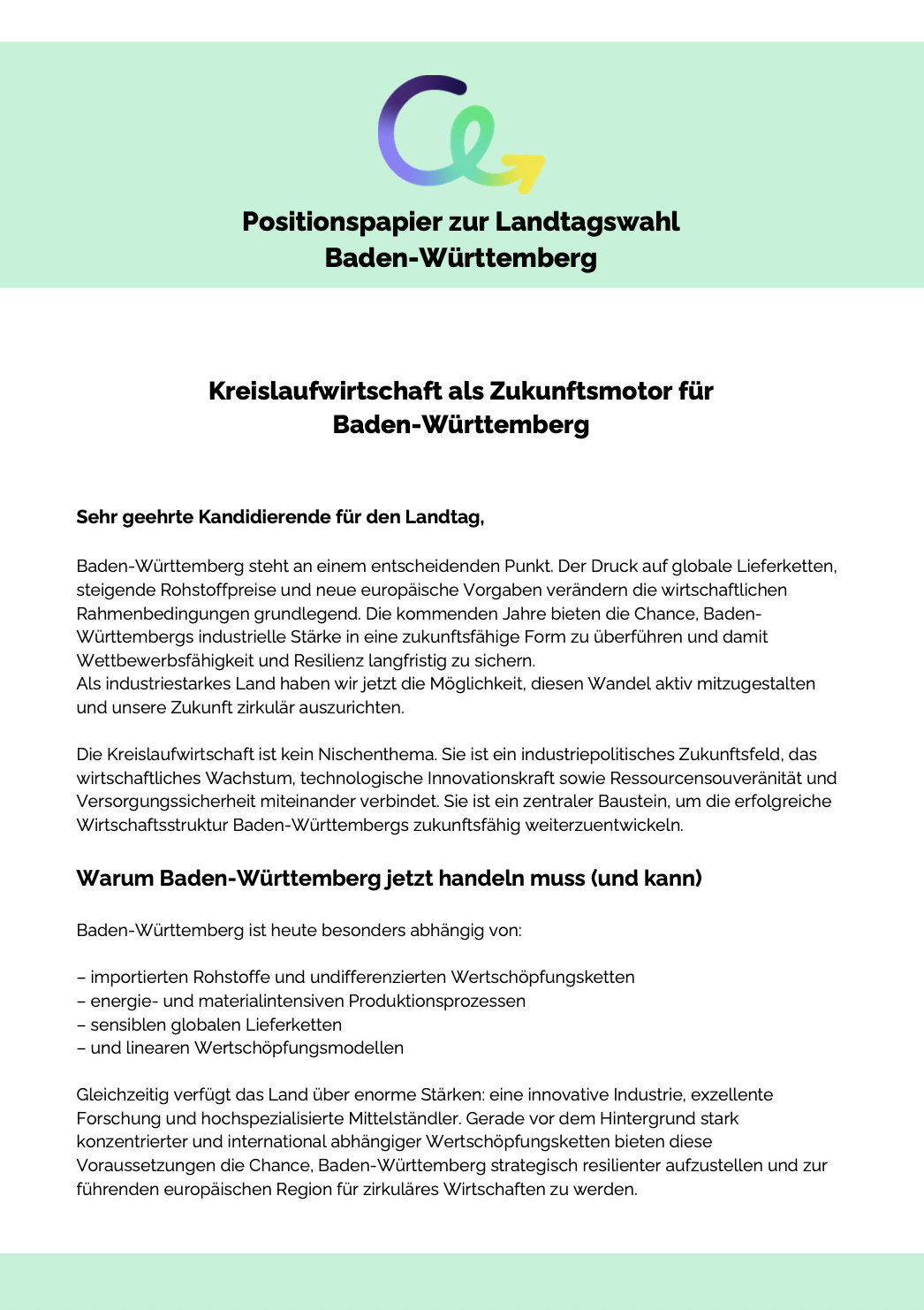 Dieses Positionspapier zur Landtagswahl zeigt, warum Circular Economy für Baden-Württemberg ein industriepolitisches Zukunftsfeld ist – und keine Nische. Wir empfehlen eine verbindliche Landesstrategie mit klaren Prioritäten: moderne Infrastruktur, zirkuläre Produkte und Geschäftsmodelle, starke Kommunen sowie gezielte Investitionen in Wissen und Innovation. So kann Baden-Württemberg Wettbewerbsfähigkeit sichern, Rohstoffabhängigkeiten reduzieren und zur führenden europäischen Region zirkulärer Wertschöpfung werden.